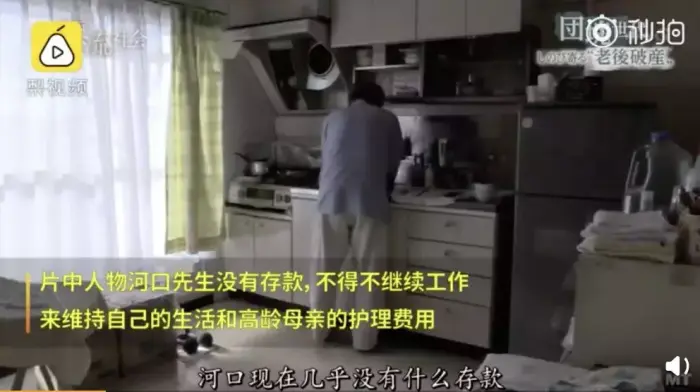 接着镜头突转,我们目睹河口先生的老年日常。他没有存款,不得不继续工作维持生计,并且还得担负高龄母亲的护理费用。