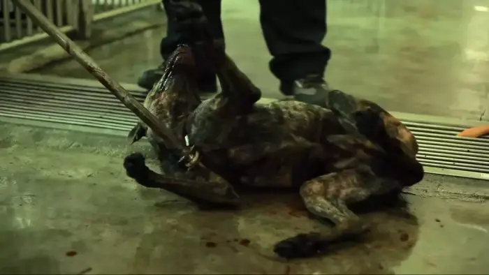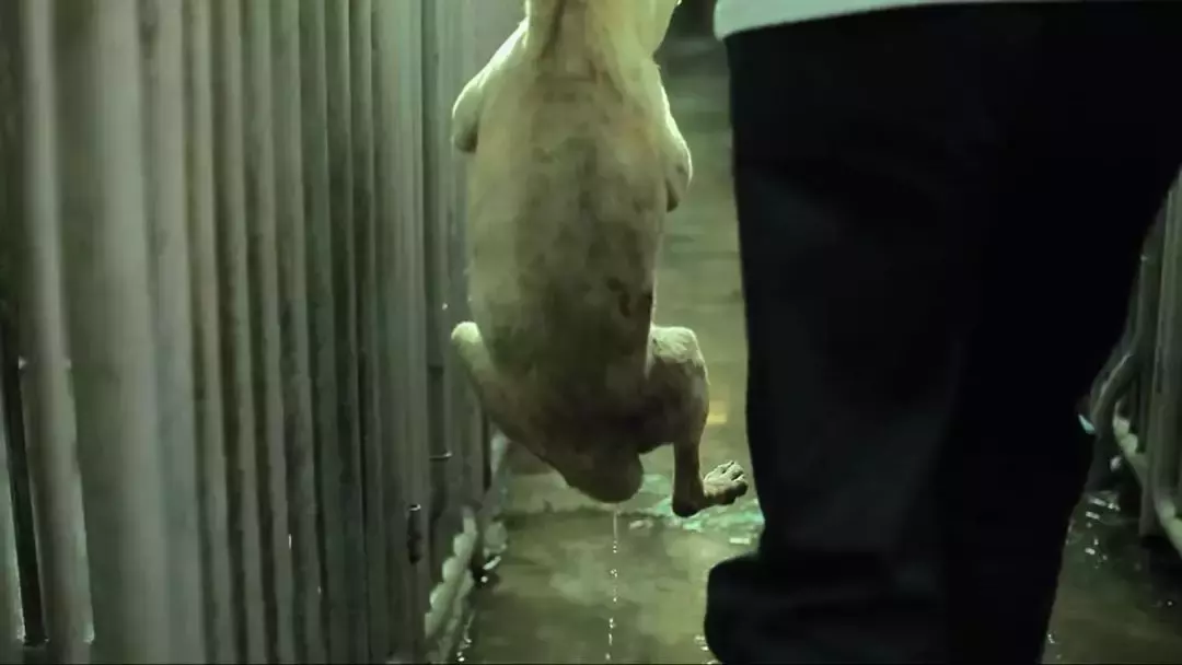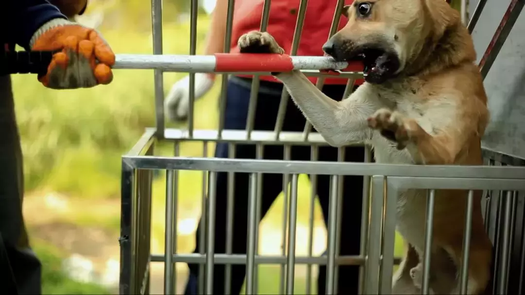 影片一开始,就看到大大小小的流浪狗被人用P型杆套着拖拽下车。