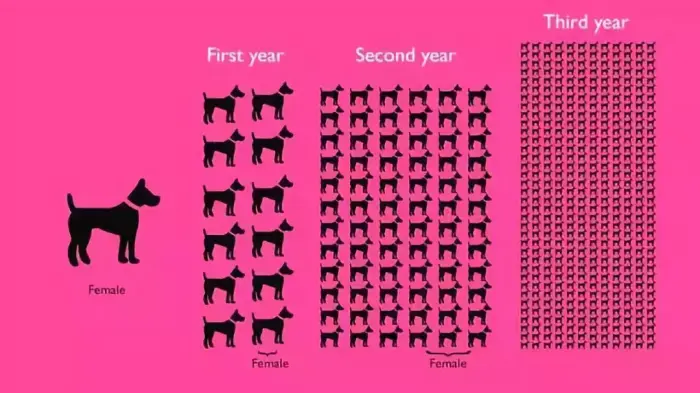 你可以估算一下,一只未结扎的母狗“一胎大概可以生 8 只,每胎有 6 只是母狗,一年两胎,两年后一只狗可以繁衍出 3136条狗”。