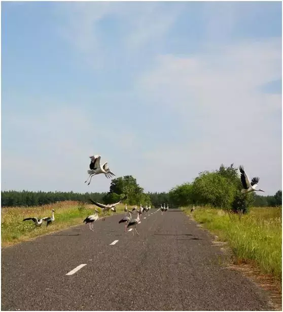 公路上停满了悠闲的鹤鸟;