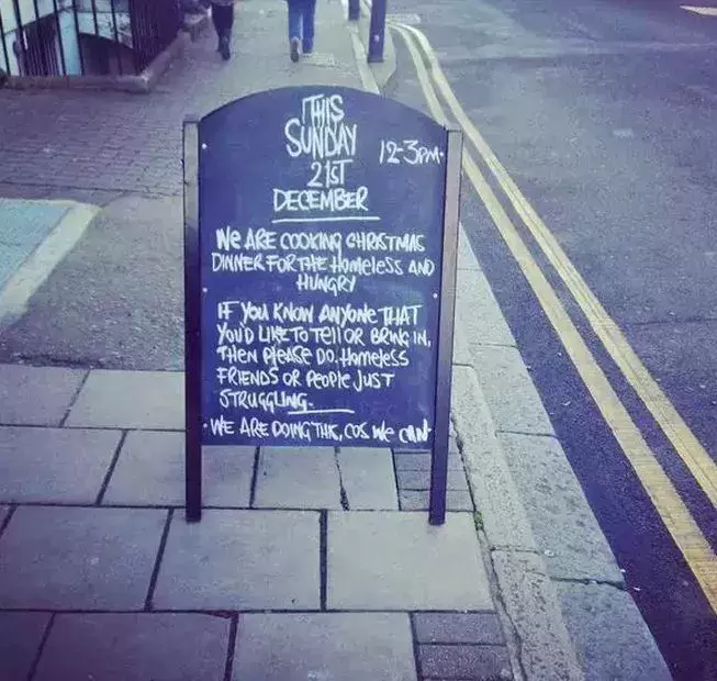 之前有个叫“威廉四世”的英国酒吧,在圣诞前夕也会写告示说在圣诞夜当天免费为流浪者提供圣诞晚餐。看似简单的一餐热饭,对于饥寒交迫的人而言却可能触碰了整个美好世界。
