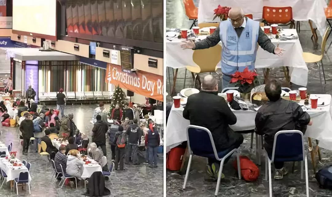 他们有一个共同的身份——流浪汉。在这个寒冷的圣诞夜,他们不仅彼此分享了美味的食物,还获得了实用的圣诞礼包,因着车站工作人员的爱与善意,他们也像其他寻常人一样体面地享受节日的欢愉。