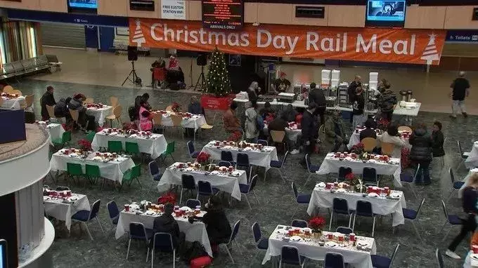 去年圣诞夜的伦敦火车站,在送完最后一批旅客后,空荡荡的大厅忽而涌入了大批戴着工作牌的人员,并有序布置起来。