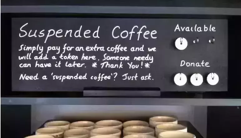 在英国还有不少咖啡馆会推出“待用咖啡”服务,客人在买咖啡的时候可以自愿付两份钱,一份自己享用,另一份待用,留给无力付费的流浪汉在寒冬时免费取用。