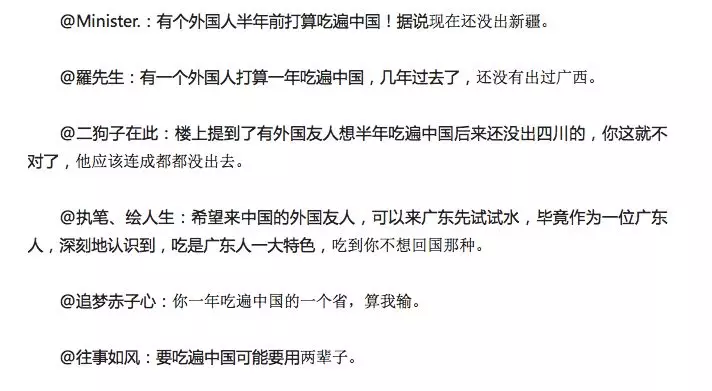 这不,前一段网上疯传,有个歪果仁号称要用半年时间吃遍中国,他的“狂妄无知”当然是被中国各地的吃货轮番吊打。这个梗一出现,网友的留言就基本保持了一个队形——“有个老外要用半年吃遍中国,结果,三个月他还没走出××城市”,然后下面就是各地的吃货们表演本地版的《报菜名》了。