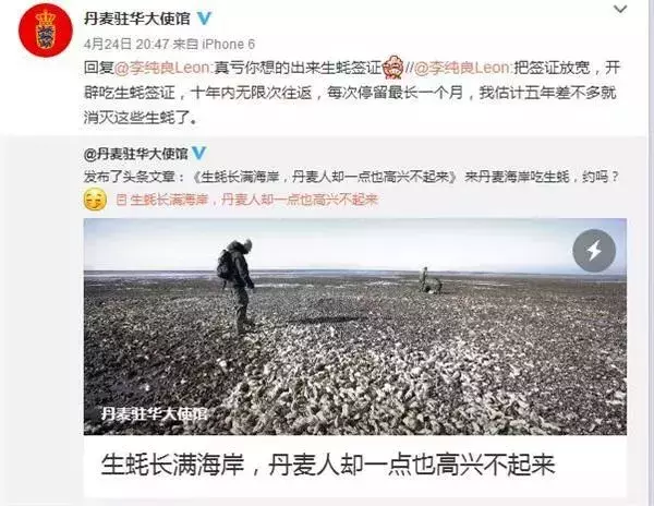 要报销路费这还真不是中国吃货小气,实在是忙不过来啊。去年,丹麦生蚝泛滥的时候,丹麦驻华大使馆微博专门发了条微博,哭唧唧地说自家海岸长满了生蚝,强烈希望中国吃货们帮帮丹麦人民。
