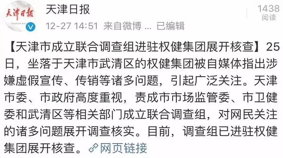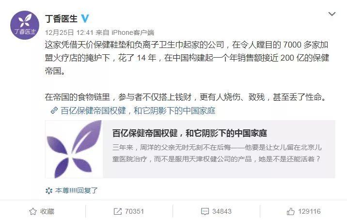 12月25日,知名大V丁香医生的一篇名为《百亿保健帝国权健,和它阴影下的中国家庭》的文章在网络掀起轩然大波,文章深刻揭露了权健圈钱的真相,随即引发全社会对权健的声讨。