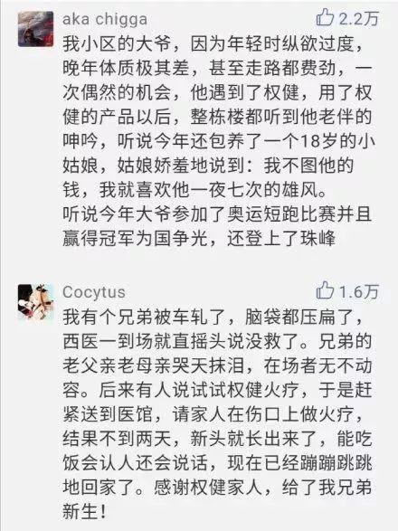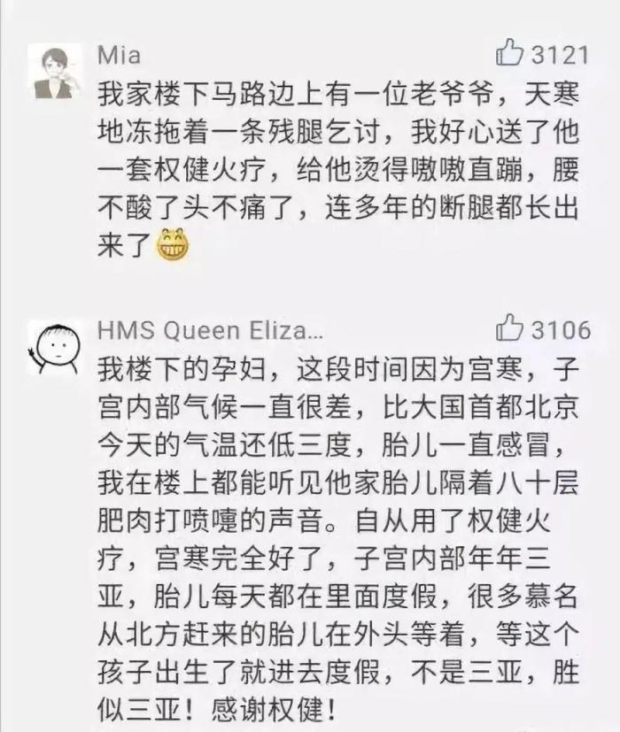 看完华妹不得不感叹,这届网友们都是人才啊!真的见识到了权健火疗的功效,从精神病到不孕不育,从换头到变性,一烧全见效。真真是妙手回春华佗在世啊!