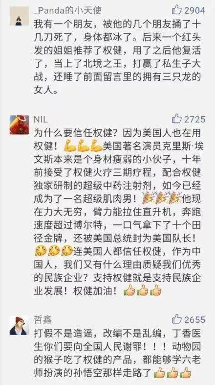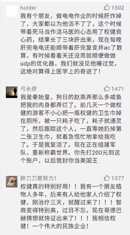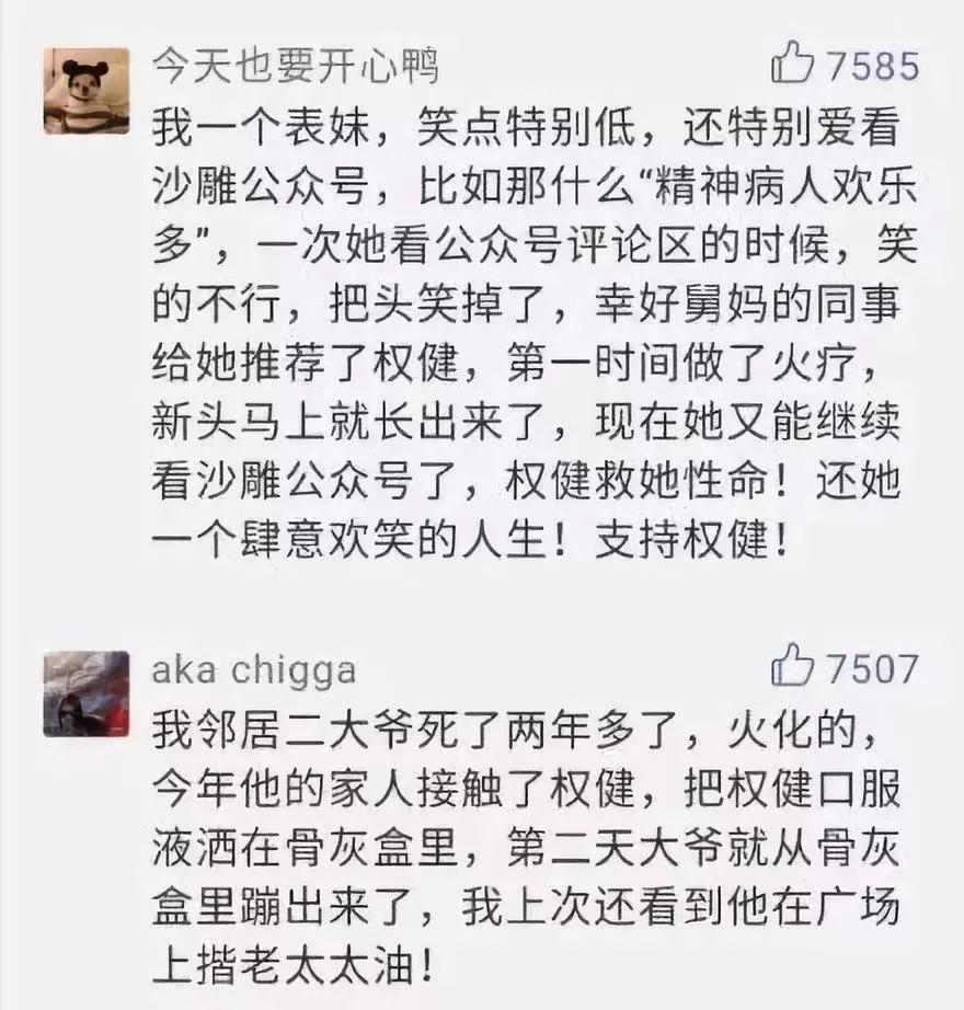 一个叫“精神病人欢乐多”的公众号发布一篇名为《权健危机!请大家支持权健,为权健正名,为祖国医药正名!》的恶搞文章,超级配合的网友齐上阵,为权健来了一场“正名”大联欢。