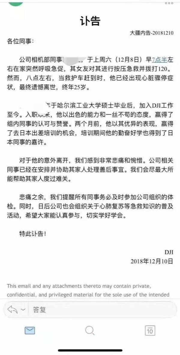 就在12月初,大疆公司一名年仅25岁的程序员,在家中猝死。这个年轻的小伙子,加入大疆公司只有3个月的时间。而在去世前,他所在的部门夜以继日地加班了一个多月,赶着推出一款新品。