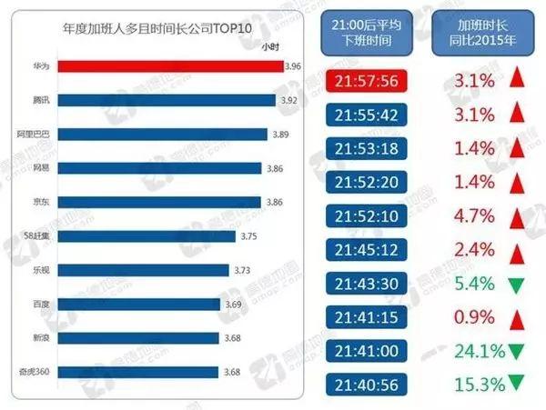 有相关统计,中国加班最狠公司排行榜,阿里巴巴仅排名第三。2016年数据,华为员工加班时间最多且最晚,平均在晚上9点57分下班,加班时间3.96小时;腾讯位居第二,平均在晚上9点55分下班,加班时间3.92小时。