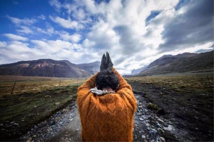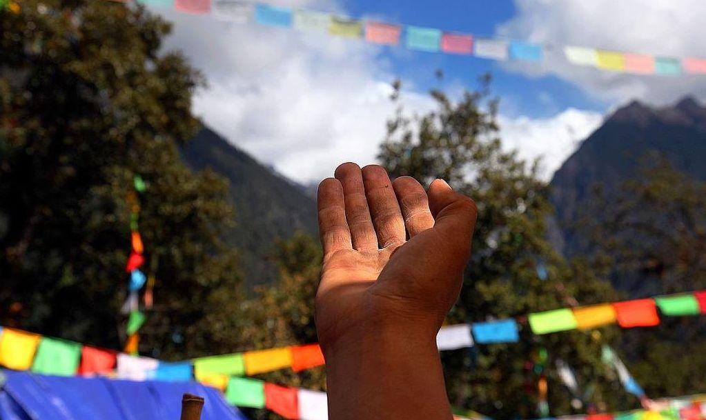当藏人介绍神山时,由衷虔敬的手势。摄影 / 马锅头