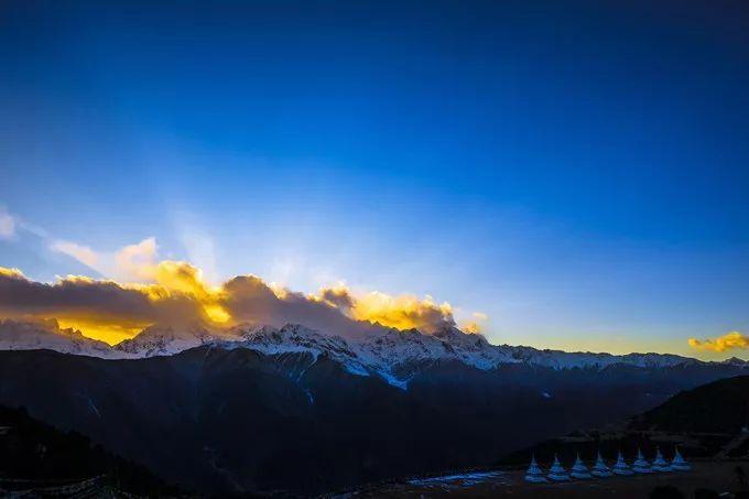 这时奇迹发生了,卡瓦格博感动了,云雾散去,就像大幕被拉开一样,阳光普照,山顶金光灿烂。