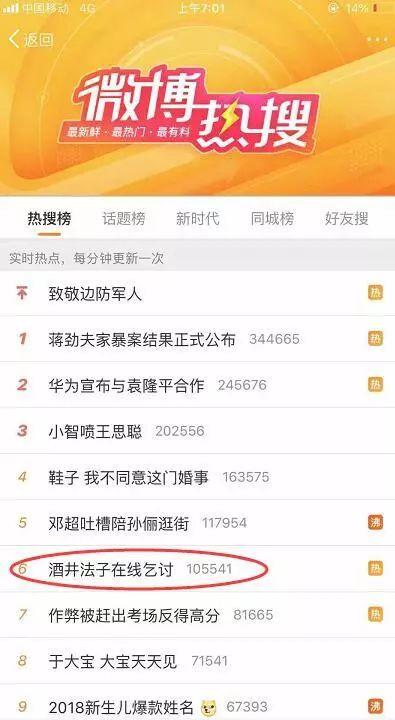 1月7日的微博热搜,一则“酒井法子在线乞讨”的标语以极快的速度飙升至排行榜前列。