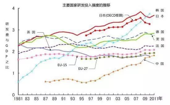 后来,日本泡沫经济崩溃后,政府依然没有吝啬于科研投入。直到现在,全社会的科研经费仍然在3%以上。