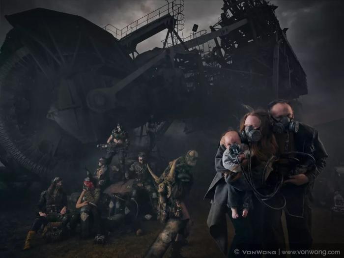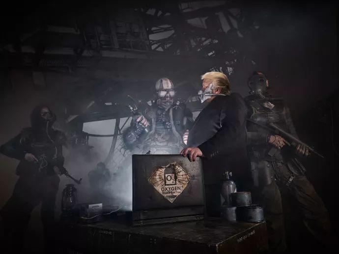 在照片中的未来世界,清洁的氧气是一种珍贵的商品,昂贵且稀有。就连“特朗普”也不得不戴着氧气面罩呼吸。