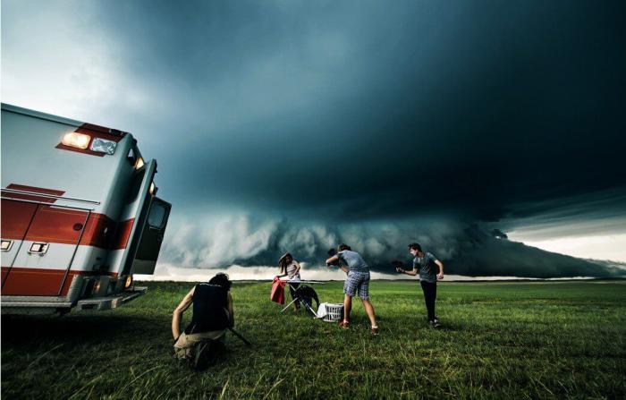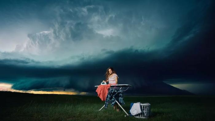 当人们躲避飓风时,他却逆行迎着暴风雨拍照,以唤醒普通人对全球变暖的关注。