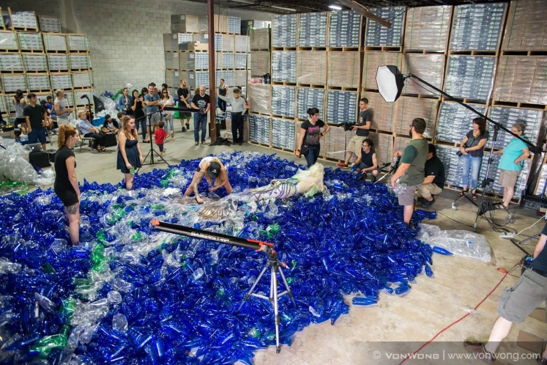 10000只塑料瓶组成的唯美海浪,美人鱼蜷曲的身体困在其中,这组照片本杰明叫它“窒息的美人鱼”。