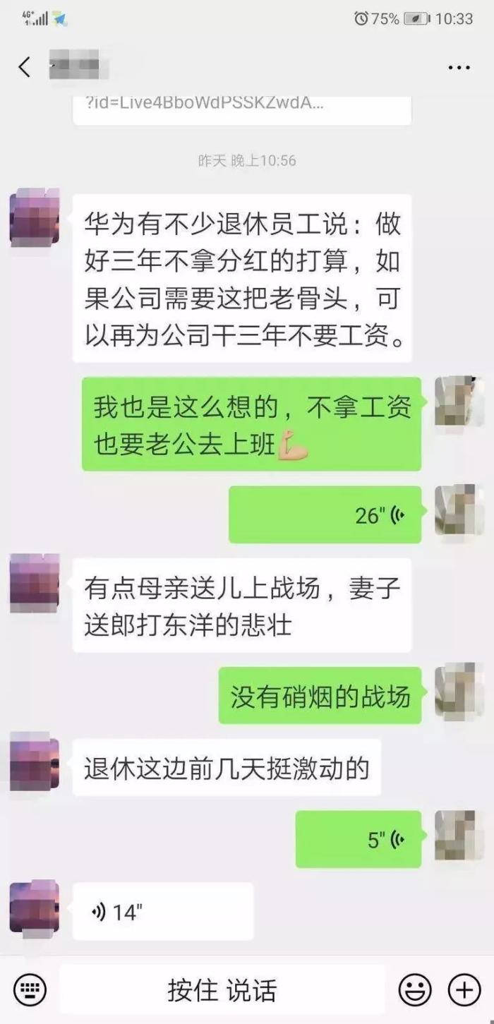 在华为这件事情发生后,网上有张截图刷屏了,图中是几位华为员工的对话。