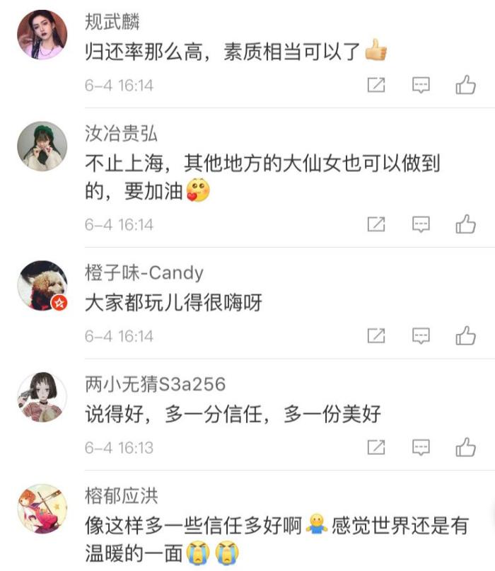 在这次上海街头的“信用借还柜”一天展览时间中,24件物品,最终只有一件遗失,其他物品大都及时归还,网友对此也是大加赞赏,认为国人的素质在不断提高,东西虽然不是特别贵重,但是人与人之间的这份信任难能可贵。