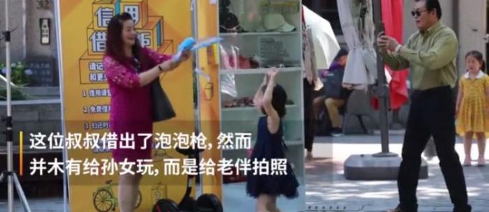 一位叔叔拿出其中的泡泡枪,没有拿给孙女玩,而是拿给老伴拍照,着实秀了把恩爱~
