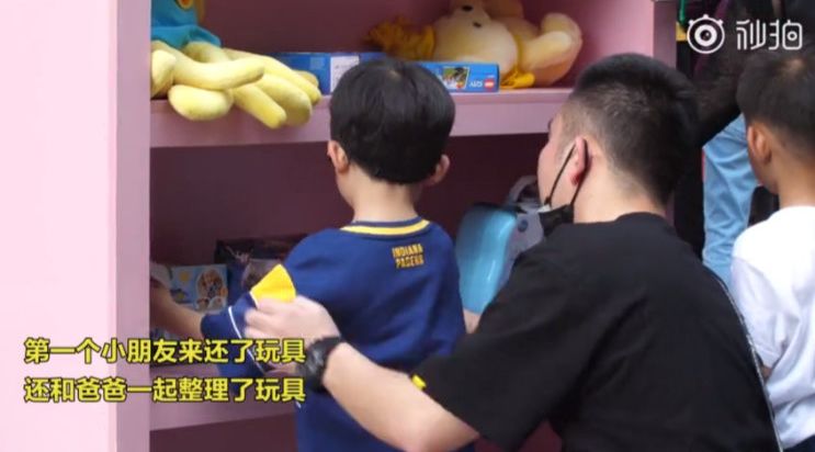 第一个来还的小朋友,不仅按时还了玩具,还和爸爸一起整理了玩具。