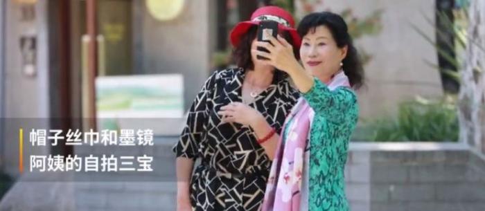 两位阿姨拿出帽子、丝巾和墨镜“自拍三宝”,开启自拍时光~