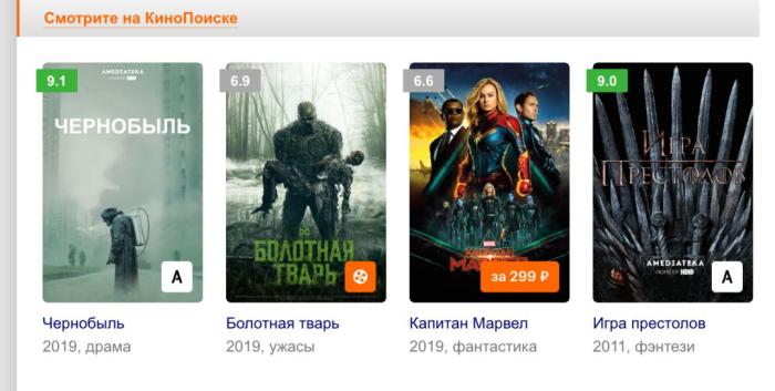 ▲КиноПоиск网站上,《切尔诺贝利》9.1分,《沼泽怪物》6.9分,《惊奇队长》6.6分,《权力的游戏》第一季9.0分