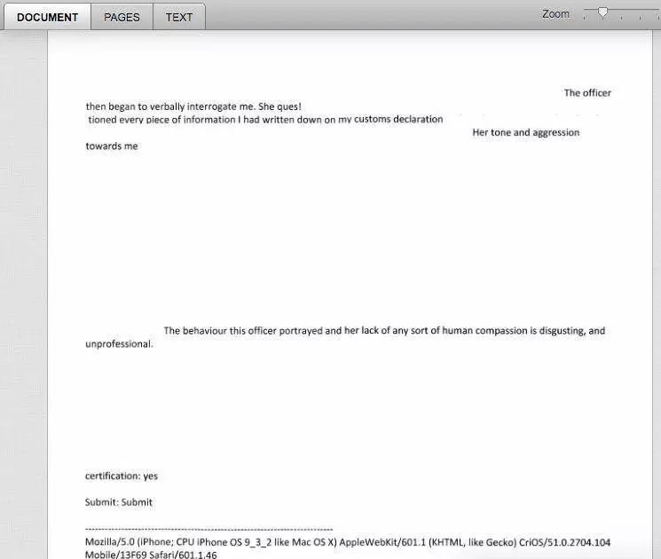 在这些投诉信中,旅客们写下了这些边境官们的暴力行径,有嘲笑、有威胁、也有歧视。