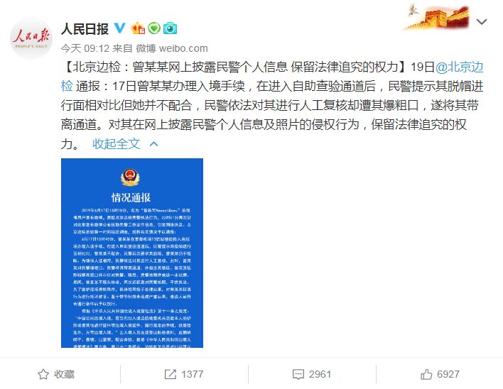 北京边检发出情况通报,称曾轶可的行为对民警身心造成严重的影响,保留法律追究的权力,人民日报随后转发。