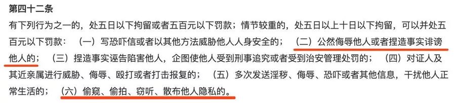 《治安管理处罚法》第四十二条中规定,公然侮辱他人或者捏造事实诽谤他人的,偷窥、偷拍、窃听、散步他人隐私的,处五日以下拘留或者五百元以下罚款;情节较重的,处五日以上十日以下拘留,可以并处五百元以下罚款。