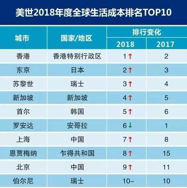 著名的美世Mercer公司,发布了2018年全球城市生活成本(苦逼指数)排行榜单。榜单中,中国香港高居全球生活成本的第一,日本东京紧随其后,排名第二,排名第三的是苏黎世。而榜单中北京、上海超越了纽约(13)、伦敦(19)等发达国家知名大城市,也进入了前10位,此外中国不少地方(深圳12位、广州15位、南京25位、天津29位等)都“喜提”全球前30排名。