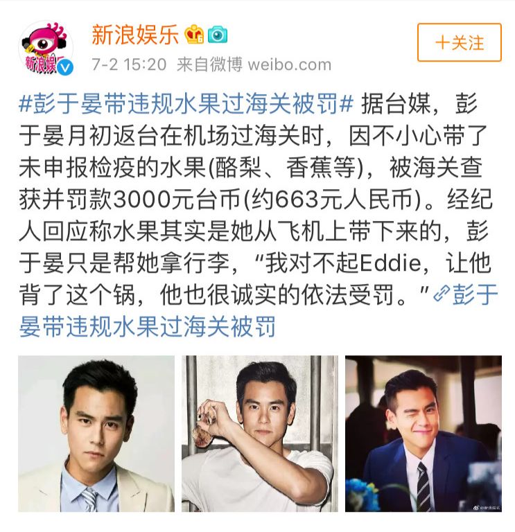 这位上热搜的明星就是彭于晏,因为帮忙经纪人携带水果过海关而被罚款3000元台币(约633元人民币)。