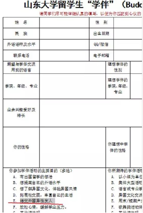 在网传的这份寻找学伴的申请表上,我们可以看到,从专业到性别,到性格,到兴趣,到交友目的:比如“结交外国异性友人”,洋洋洒洒, 分类细致,十分全面。