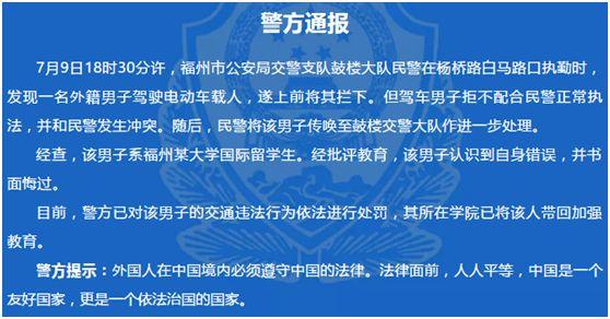 可是当晚,福州公安发布通报却称:这位外国男子是当地某大学国际留学生,经批评教育,已书面悔过。