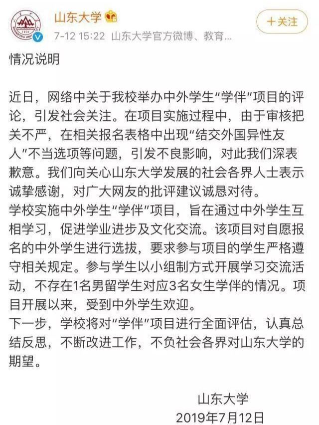 今天(7月12日),山大发表致歉声明,称项目不存在1名男留学生对应3名女生学伴的情况,而参与项目的学生必须严格遵守相关规定。