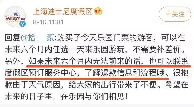 就像这次在遭遇台风天气不得不闭馆,被消费者们质疑不能退票不合理时,迪士尼立马发布公告,告诉游客如果六个月内无法前来的话,可以联系服务中心了解退款信息。