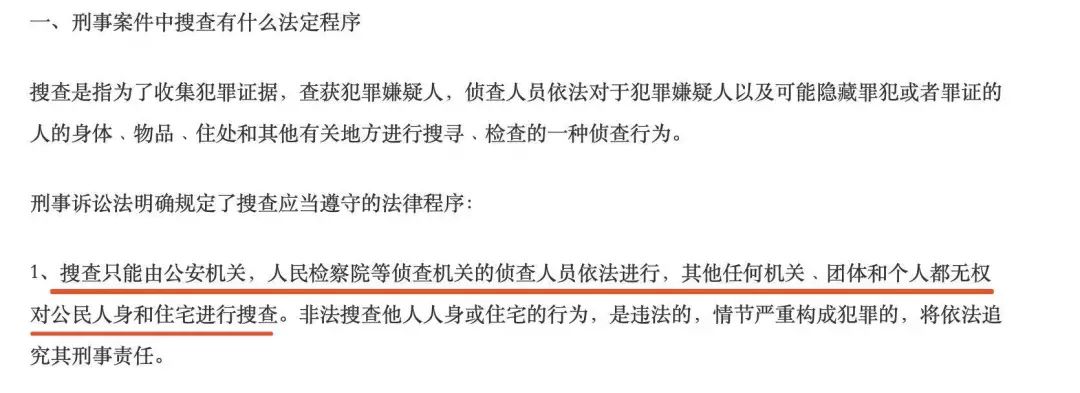我国法律明确规定,“搜查”只能由司法机关按法定程序实施,其他机关团体和个人,压根没有这项权利。
