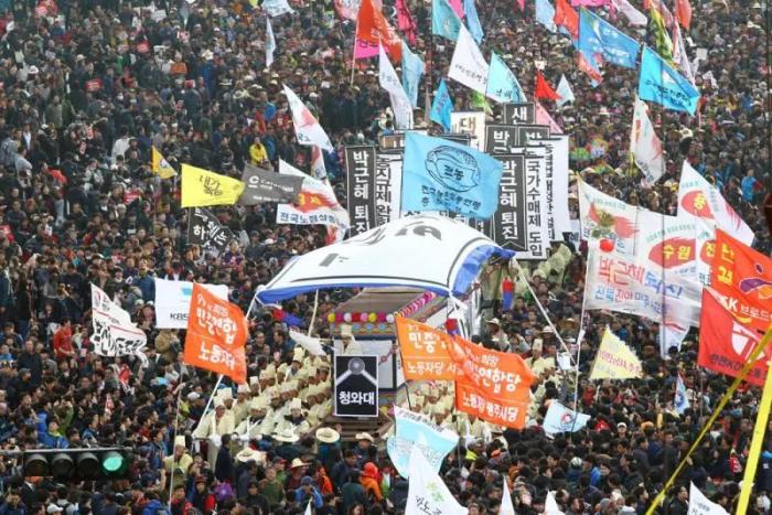 ▲ 韩国民众不只一次抬着棺材去青瓦台游行。2016年11月12日,韩国民众抗议“朴槿惠亲信干政”事件游行,中间是巨大的棺材,周围是穿着丧服的民众