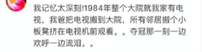 但这样的条件掩盖不住大家的热情,在黑白电视机的上方,巷子里的人还专门做了一条横幅