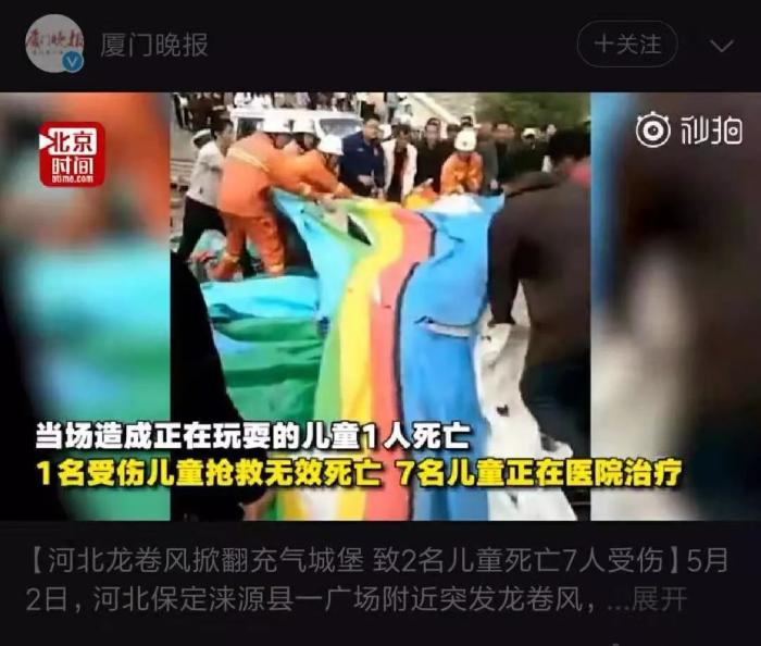 同样的悲剧还出现在了河南商丘,2019年3月31日下午,突发的龙卷风将充气城堡掀翻后吹刮到空中,造成2人死亡,20人受伤。