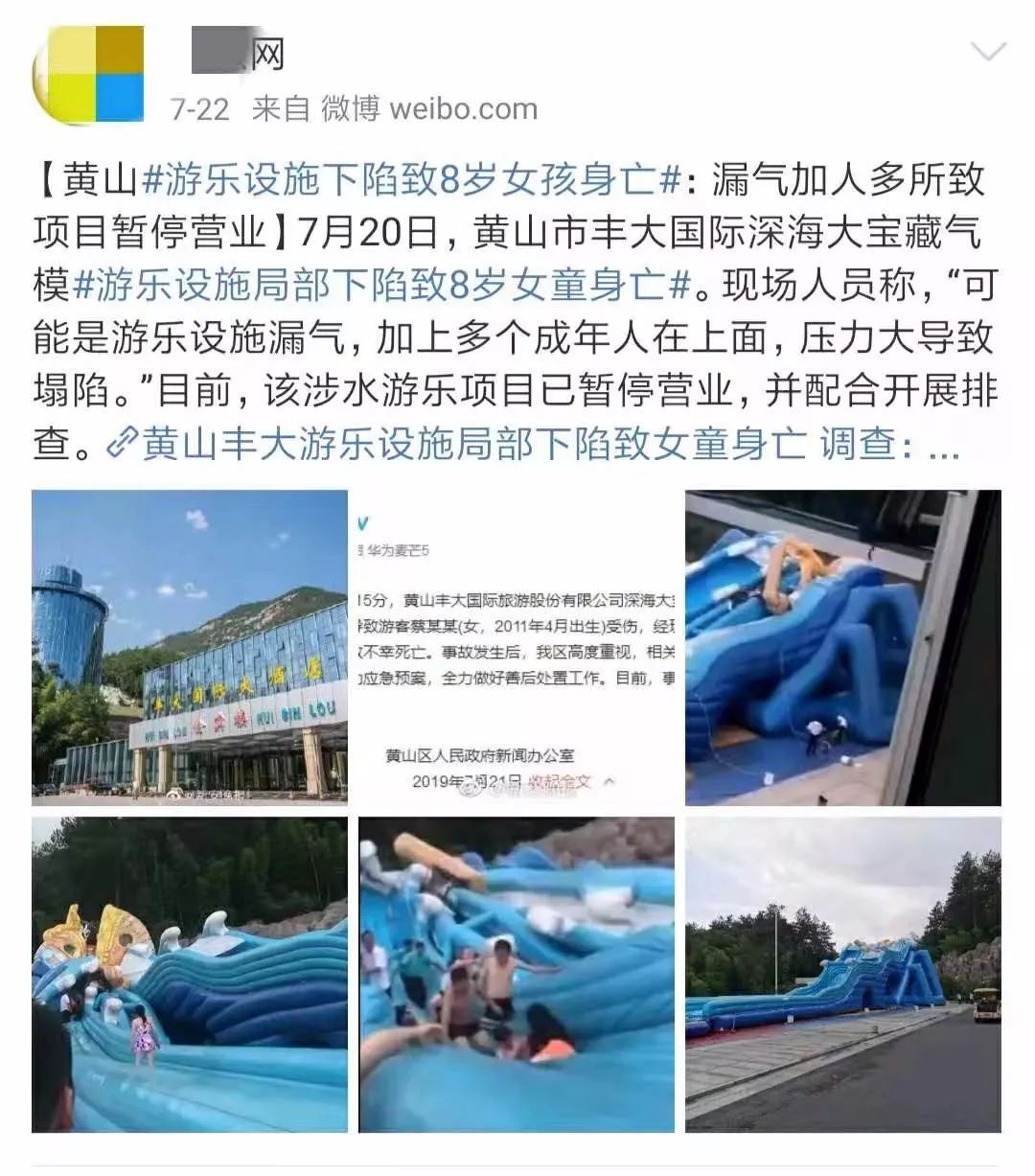 2019年7月,安徽黄山的丰大国际酒店内,数名游客玩耍的“深海大宝藏”气模设施突然出现局部下陷,致使5名游客被挤压受伤,其中一名8岁的南京女孩经抢救无效死亡。
