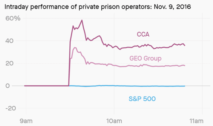 于是,在奥巴马期间处于颓势的私营监狱在特朗普上任之后局势逆转。特朗普上任第二天,私营监狱两大巨头CCA和GEO的股票就分别上涨了43和22个百分点。