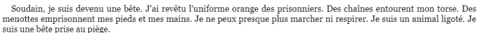 “我穿着橘黄色的球服,手脚都被铁链束缚着,压在胸前的铁链让我呼吸困难。”