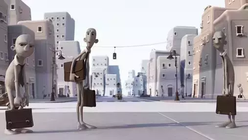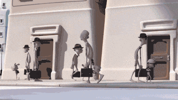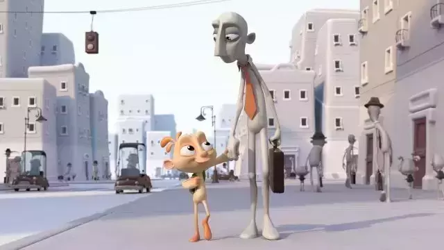 而已经被“驯化”好的父亲,每天在单调的工作中并不开心。当他工作的时候,他就变成了和同事一样的灰色,生无可恋地机械重复。只有当他和开心的小孩拥抱的瞬间,他才恢复本来的色彩。可是,有一天,当他和孩子拥抱时,本色也没有回来,因为怀里的小孩已经不开心了,成了同样生无可恋的规规矩矩的小版成年人。