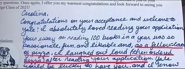 而卡洛琳娜的作文写了什么呢?她写了她如何爱吃披萨及订披萨给她带来的特别的感受等等。寥寥数语、平实幽默,让录取老师读得捧腹大笑,她便被录取了。不仅如此,录取老师还在打印的录取信上亲笔附上一小段,对她表示祝贺及欢迎。