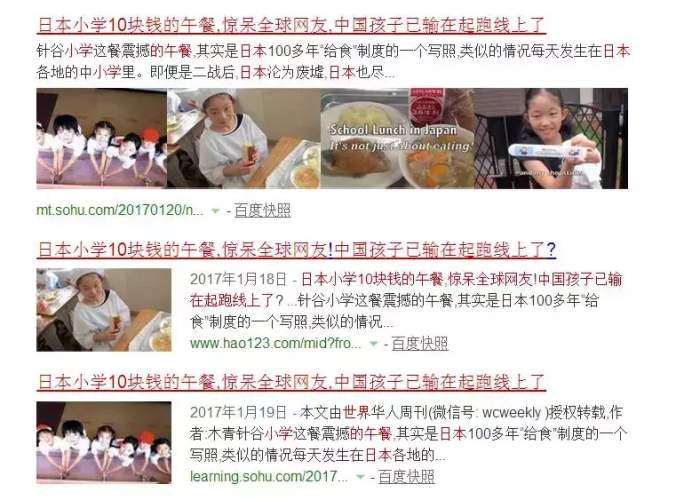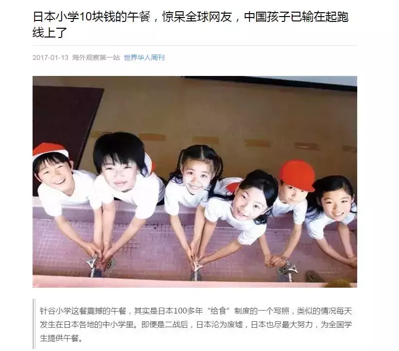 今年1月,“世界华人周刊”刊发《日本小学10块钱的午餐,惊呆全球网友,中国孩子已输在起跑线上了》一文,引发热议,阅读量近300万。