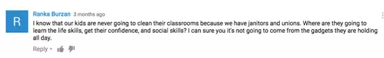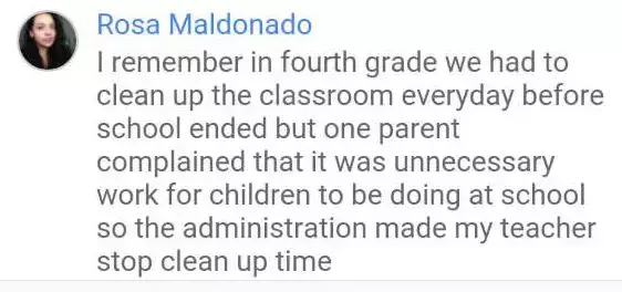 一位美国妹子回忆道,她四年级的时候,每天放学前都要打扫教室。但是一位家长到学校反映,没必要让孩子在学校打扫卫生。所以学校管理层就把打扫停了。