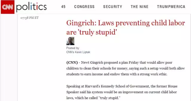 Gingrich认为禁止儿童劳动是“真正的愚蠢” 图片来源:CNN网站