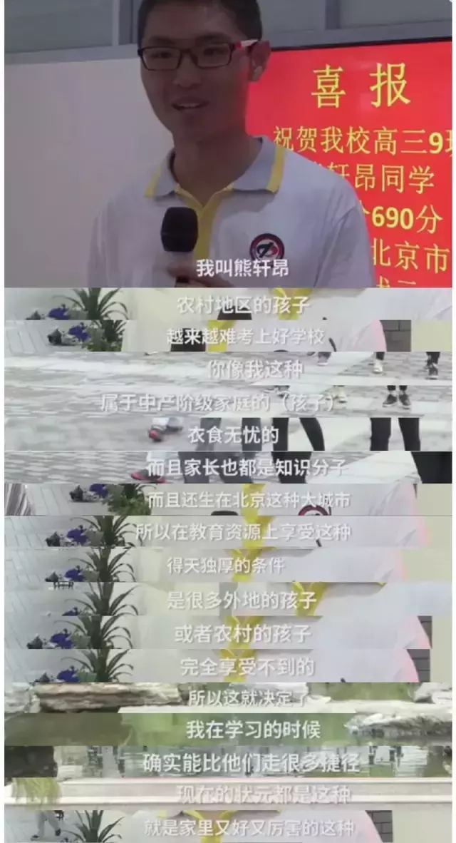 在接受澎湃新闻采访时,问到“你还相信知识改变命运吗”,他说“我觉得农村地区的孩子越来越难考上好学校,我是普通家庭长大的,但是衣食无忧,父母都是知识分子,而且在北京这种大城市,在教育资源上享受到这种得天独厚的条件可能是外地孩子或农村孩子所完全享受不到的,这种东西让我在学习的时候可能相对来说能走一些捷径。近几年的高考状元,也很难再看到农村里面供养出来的,很多都是家境又好,自己又厉害的人。但我还是觉得,知识不一定能够改变命运,但是你没有知识是一定改变不了命运的。”